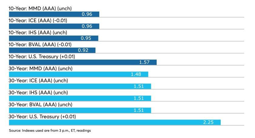 High-grade municipals were steady, according to final readings on Refinitiv MMD’s AAA. Short yields in 2021 and 2022 were unchanged at 0.07% and 0.10%, respectively. The yield on the 10-year sat at 0.96% while the yield on the 30-year was also unchanged at 1.48%