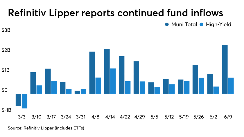 In the week ended June 9, weekly reporting tax-exempt mutual funds saw $2.462 million of inflows, according to Refinitiv Lipper. It followed an inflow of $997.358 million in the previous week.