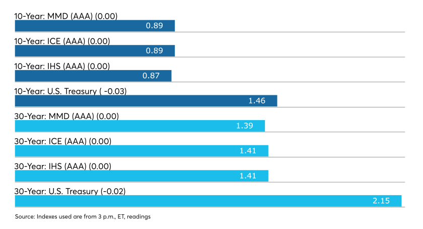 The IHS Markit municipal analytics AAA curve showed short yields at 0.06% and 0.09% in 2021 and 2022, respectively, with the 10-year at 0.87% and the 30-year yield at 1.41%.