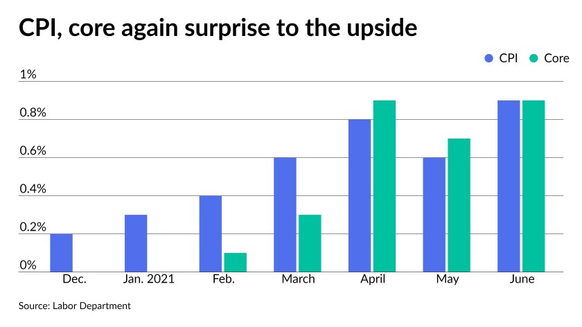 The consumer price index soared a seasonally adjusted 0.9% in June after rising 0.6% in May, while the core rate also jumped 0.9% after a 0.7% gain in May. The headline number increase was the largest since a 1.0% climb in June 2008.