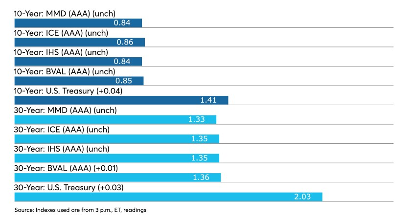 The IHS Markit municipal analytics curve showed short yields at 0.07% and 0.10% in 2022 and 2023, respectively, with the 10-year steady at 0.84%, and the 30-year yield also unmoved at 1.35%.