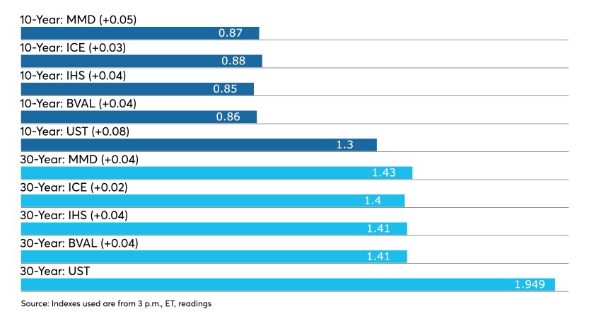 The IHS Markit municipal analytics curve saw the one-year rise two to 0.07% and the two-year to 0.08%, with the 10-year up four basis points to 0.85%, and the 30-year yield up four to 1.41%.