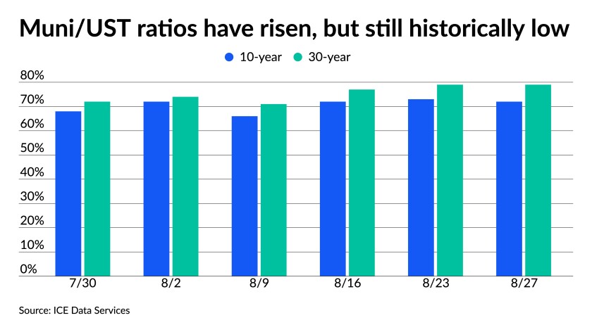 Ratios were little changed Friday with the 10-year muni-to-Treasury ratio at 69% and the 30-year at 79%, according to Refinitiv MMD. The 10-year muni-to-Treasury ratio was at 72% while the 30-year was at 79%, according to ICE Data Services.
