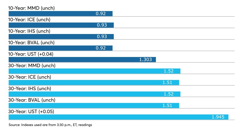 The IHS Markit municipal analytics curve showed short yields steady at 0.08% and 0.10% in 2022 and 2023. The 10-year yield stayed at 0.93% and the 30-year yield held steady at 1.52%.