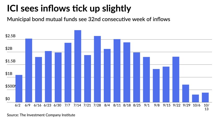 Another round of inflows was reported from the Investment Company Institute — the 32nd consecutive week — coming in at $385 million for the week ending Oct. 13, up from $308 million the week prior.