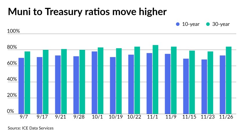 The 10-year muni-to-Treasury ratio was calculated at 70.2% while the 30-year muni-to-Treasury ratio stood at 81.7%, according to MMD.