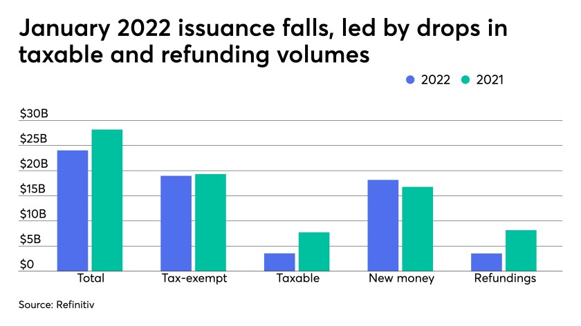 January municipal bond issuance declined 14.7% year-over-year led by a steep drop in taxable and refunding volumes amid extreme volatility and a rising-rate environment.