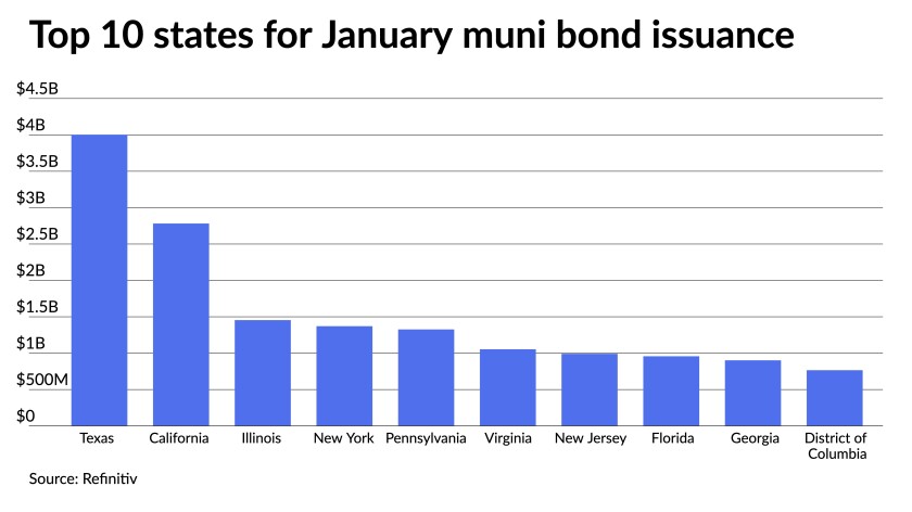 Issuance of revenue bonds decreased 21.6% to $12.817 billion from $16.346 million billion in January 2021, and general obligation bond sales dropped 5.2% to $11.223 billion from $11.835 billion in 2021.