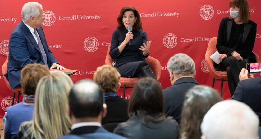 New York Gov. Kathy Hochul talks about a $4 billion state bond referendum Thursday at a panel sponsored by the Jeb E. Brooks School of Public Policy’s Institute of Politics and Global Affairs at Cornell University.