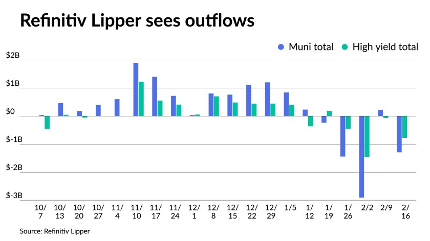 In the week ended Feb. 16 weekly reporting tax-exempt mutual funds saw investors pull more money out with Refinitiv Lipper reporting $1.293 billion of outflows Thursday, following an inflow of $215.512 million the previous week.