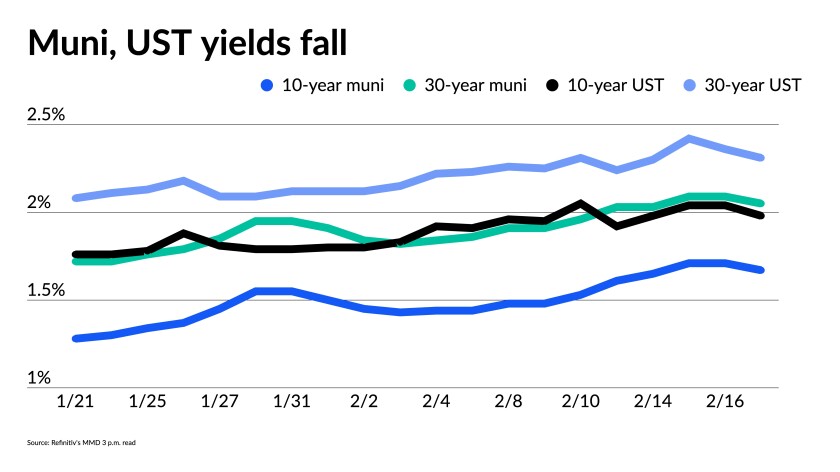 The municipal to UST ratio five-year was at 76%, 84% in 10 and 88% in 30, according to Refinitiv MMD’s 3 p.m. read. ICE Data Services had the five at 75%, the 10 at 87% and the 30 at 90% at a 4 p.m. read.