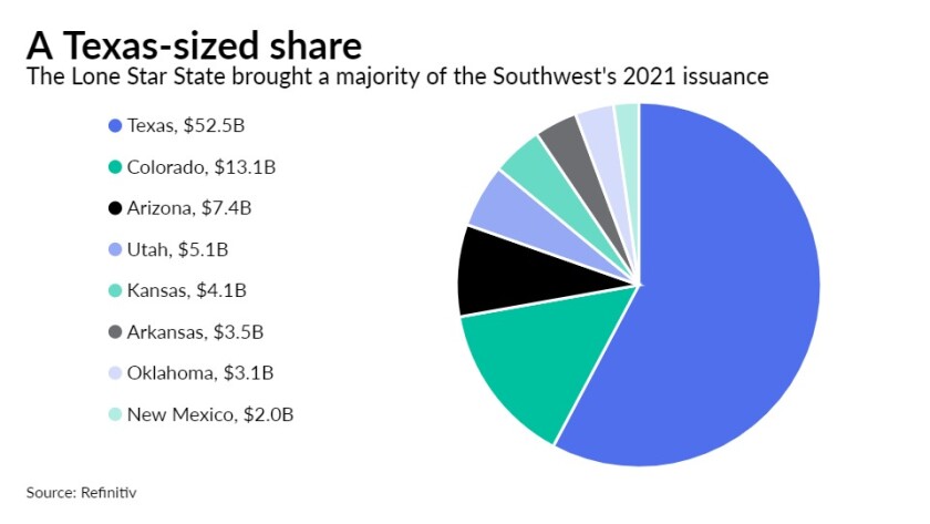Municipal bond issuers in the Southwest sold $90.8 billion of debt in 2021, down 3.2% from 2020, according to Refinitiv data, as lost refunding volume outpaced a gain in new-money sales.
