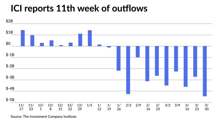Investors pulled more from municipal bond mutual funds as the Investment Company Institute on Wednesday reported $4.459 billion of outflows in the week ending March 30, up from $2.728 billion of outflows in the previous week.