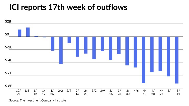 Wednesday marked the 17th week of outflows from municipal bond mutual funds, with the Investment Company Institute reporting investors pulled $7.270 billion from muni bond mutual funds in the week ending May 11 — the largest of 2022 so far. This is up from $6.167 billion of outflows in the previous week.