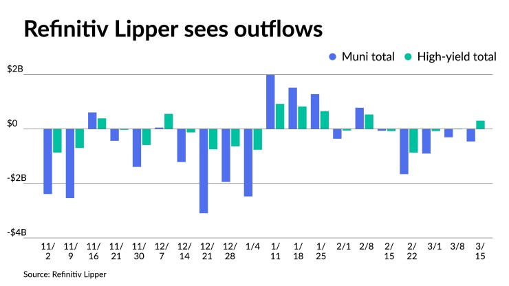 Outflows continued as Refinitiv Lipper reported $461.123 million was pulled from municipal bond mutual funds in the week that ended Wednesday after $307.815 million of outflows the week prior.