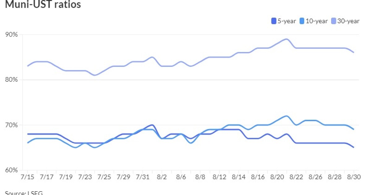 The two-year muni-to-Treasury ratio Friday was at 63%, the three-year at 64%, the five-year at 65%, the 10-year at 69% and the 30-year at 86%, according to Refinitiv Municipal Market Data’s 3 p.m. EST read. ICE Data Services had the two-year at 63%, the three-year at 64%, the five-year at 65%, the 10-year at 70% and the 30-year at 87% at 3:30 p.m.