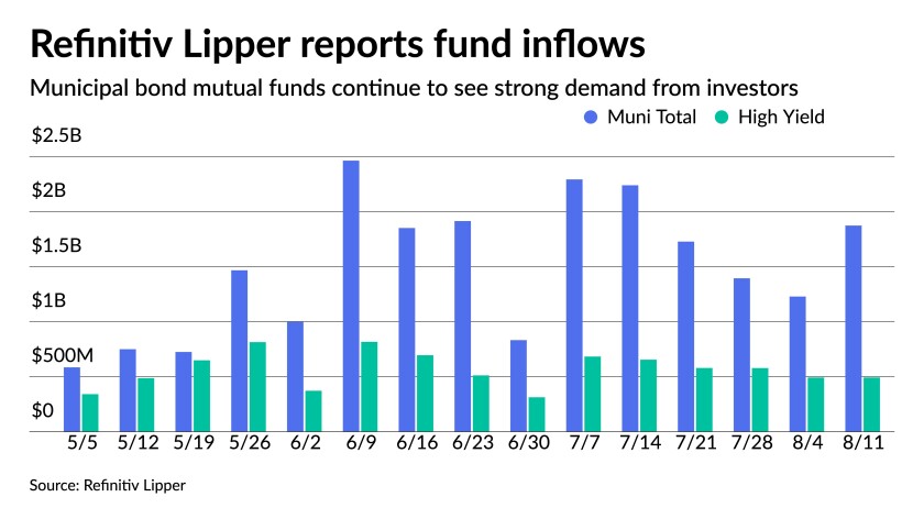 Refinitiv Lipper reported $1.87 billion of inflows into municipal bond mutual funds for the week ending August 11, up from the previous week’s $1.23 billion and the 23rd straight week of positive flows. High-yield saw $493 million of inflows.