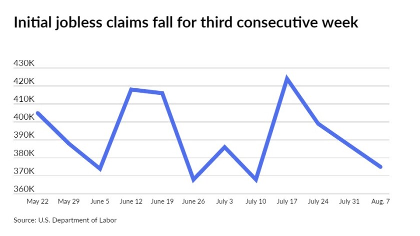 Initial jobless claims fell to 375,000 in the week ended Aug. 7 on a seasonally adjusted basis, from an upwardly revised 387,000 the week before, first reported as 385,000 claims.