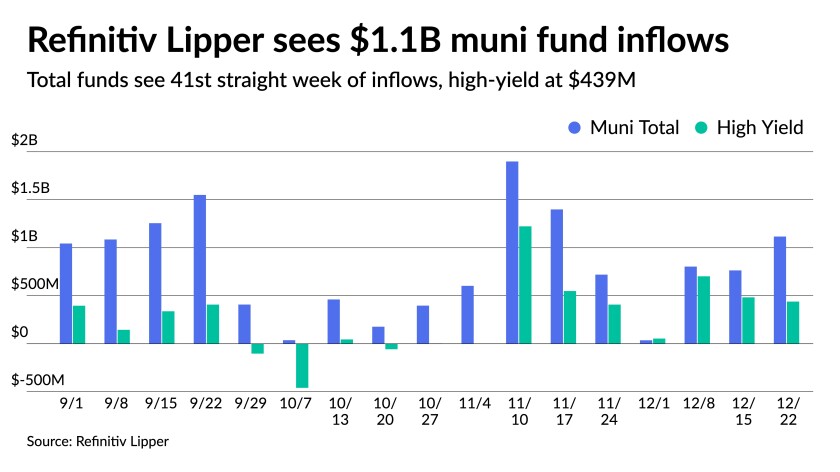 In the week ended Dec. 22, weekly reporting tax-exempt mutual funds saw $1.116 billion of inflows, Refinitiv Lipper said Thursday. It followed an inflow of $803.635 million in the previous week.