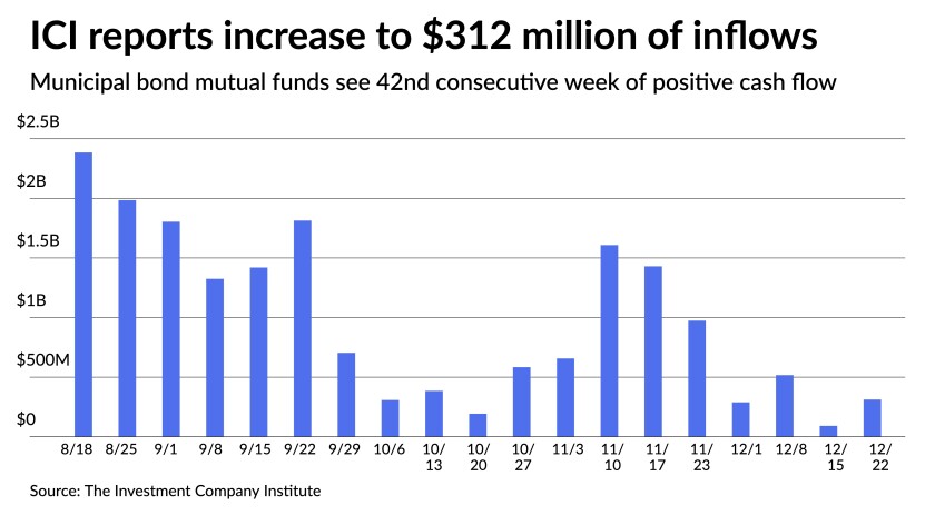 The Investment Company Institute reported $312 million of inflows into municipal bond mutual funds in the week ending Dec. 22, up from $91 million in the previous week.