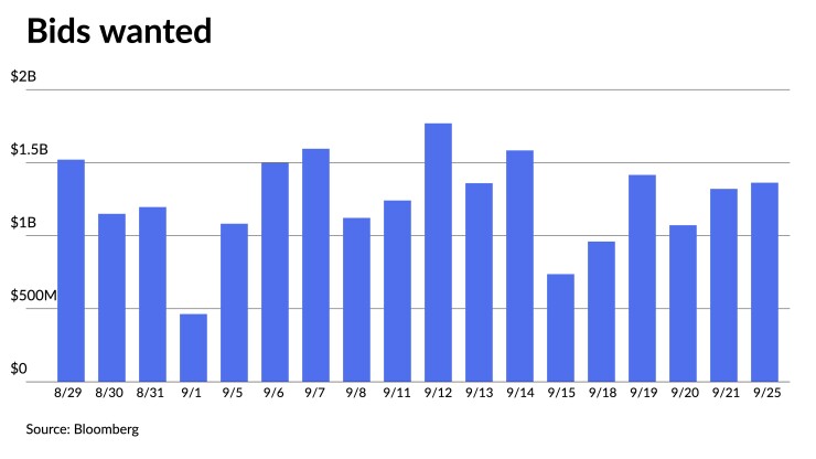 Triborough Bridge and Tunnel Authority 5s of 2047 at 4.55%-4.54%. Massachusetts 5s of 2048 at 4.54% versus 4.35%-4.34% Thursday and 4.16%-4.15% on 9/12. San Jose Financing Authority 5s of 2052 at 4.24%-4.21%.