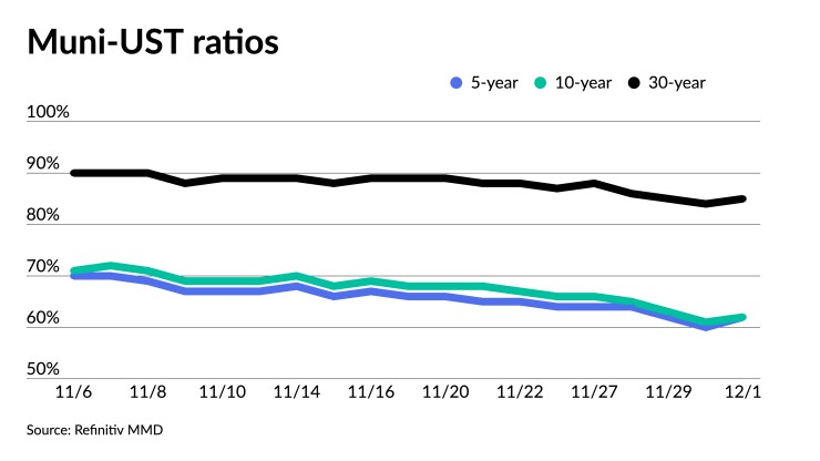 The two-year muni-to-Treasury ratio Friday was at 62%, the three-year at 62%, the five-year at 62%, the 10-year at 62% and the 30-year at 85%, according to Refinitiv Municipal Market Data’s 3 p.m., ET, read. ICE Data Services had the two-year at 60%, the three-year at 60%, the five-year at 59%, the 10-year at 61% and the 30-year at 83% at 4 p.m.
